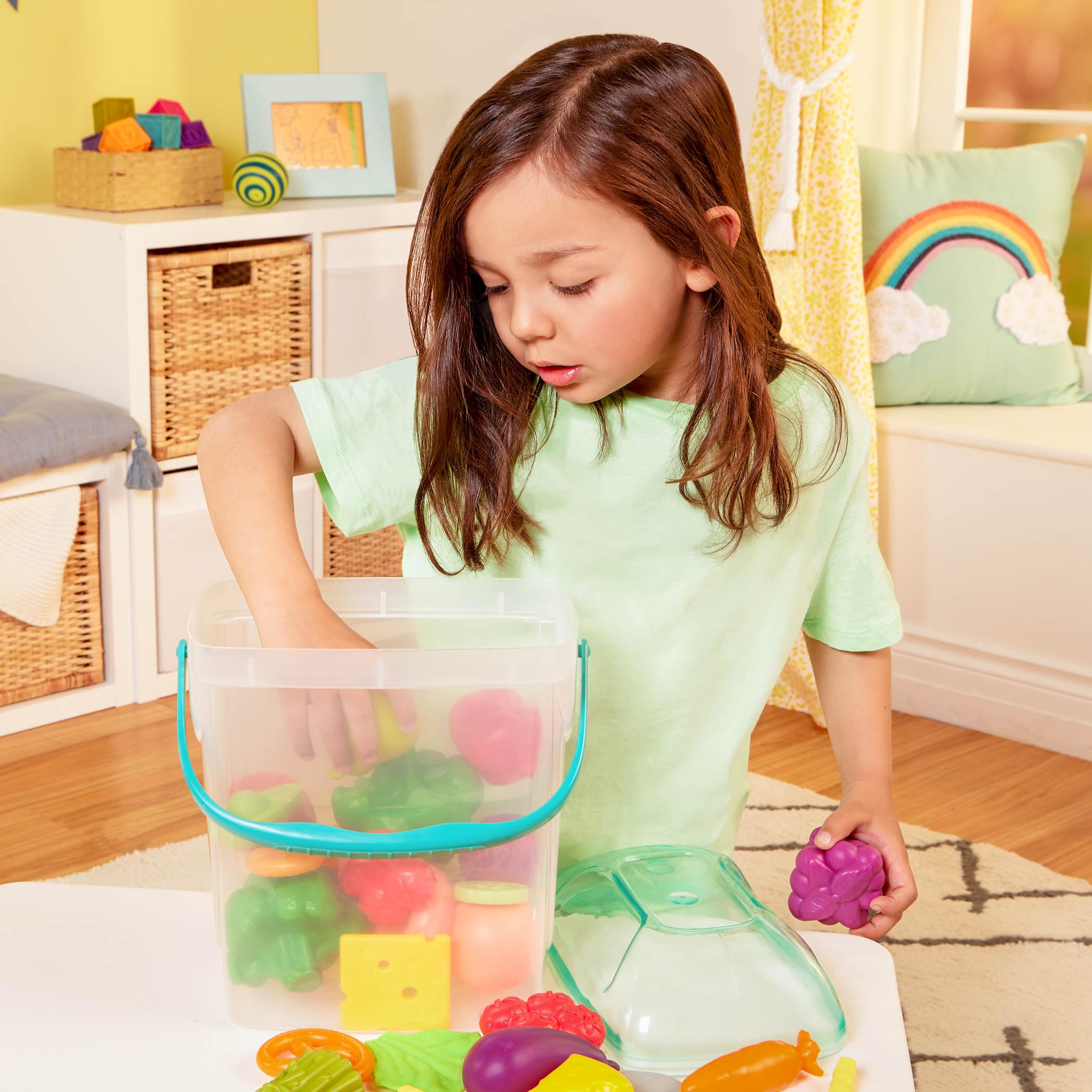 B. toys – Foodie Fun – Pretend Play Food & Board Book Set – 32 Pieces of Play Food – Educational Book for Toddlers – Storage Bucket with Lid – 2+ Years